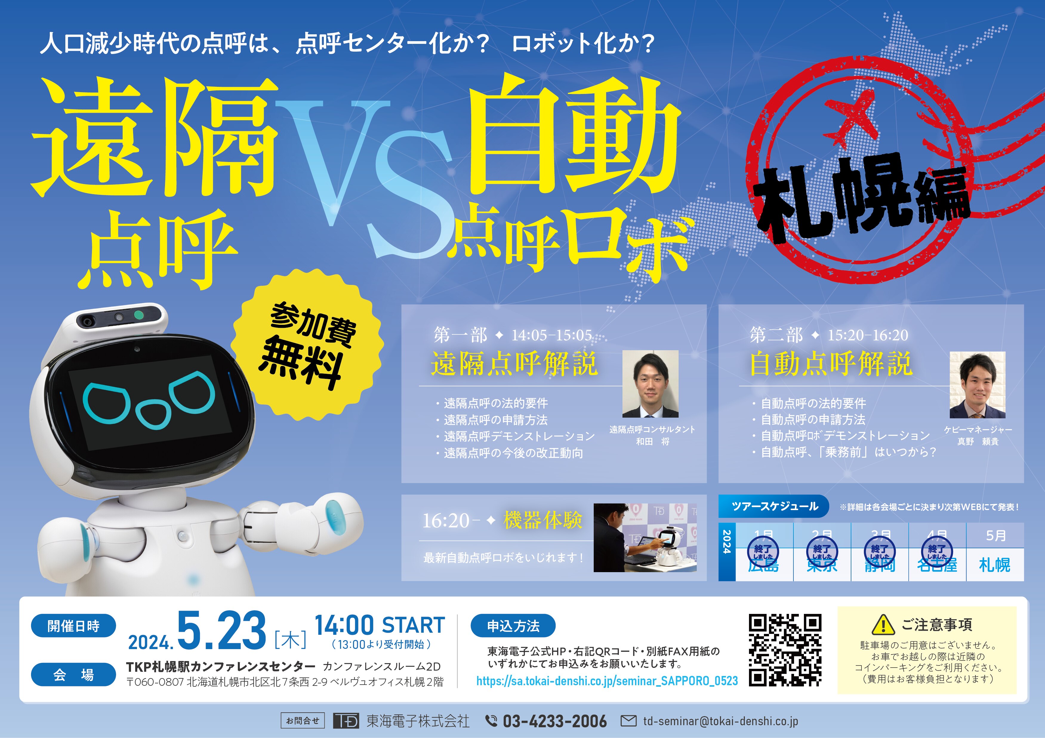 東海電子は自動点呼ロボ全国ライブツアーを開催します。 人口減少時代の点呼は、点呼センター化か? ロボット化か? 遠隔点呼と自動点呼について詳しく解説いたします。 ぜひこの機会にケビーをご体験ください。
